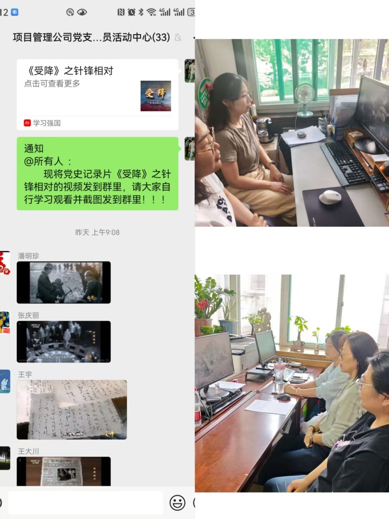 9月1日,項目管理公司黨支部開展“重溫歷史 奮勇爭先”主題活動?;顒又?,全體黨員干部共同觀看黨史紀錄片《受降》,紀錄片以詳實的史料、珍貴的影像生動展現中國共產黨始終以人民利益為根本,在復雜形勢下堅守信仰、運籌帷幄的政治智慧和使命擔當,引導黨員干部不斷加強黨史學習,切實把優秀歷史經驗轉化為推動工作的實際行動。
